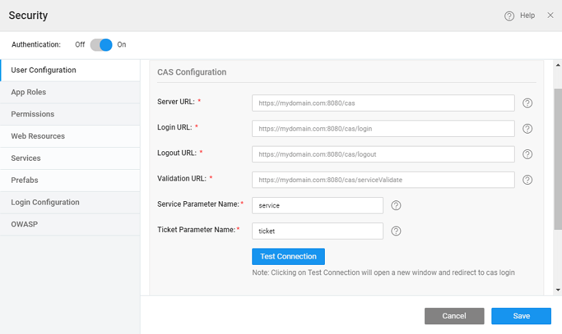 To set up authentication using a Central Authentication Service in WaveMaker apps, enable from the security dialog, choose CAS as the Security Provider.