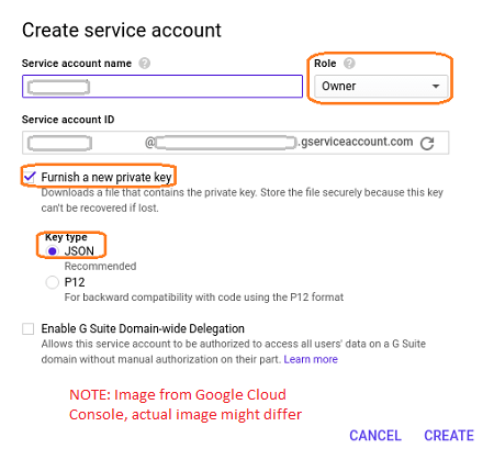 - Service Account Id: You will get this when creating a Service account. This account should have Role set to Owner and Key Type as JSON (see here on how to obtain it)
