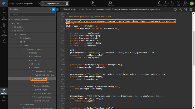 In addition to the standard APIs generated for the imported databases, the tables with temporals will have an additional period APIs auto-generated. This can be used to access the temporal data.
