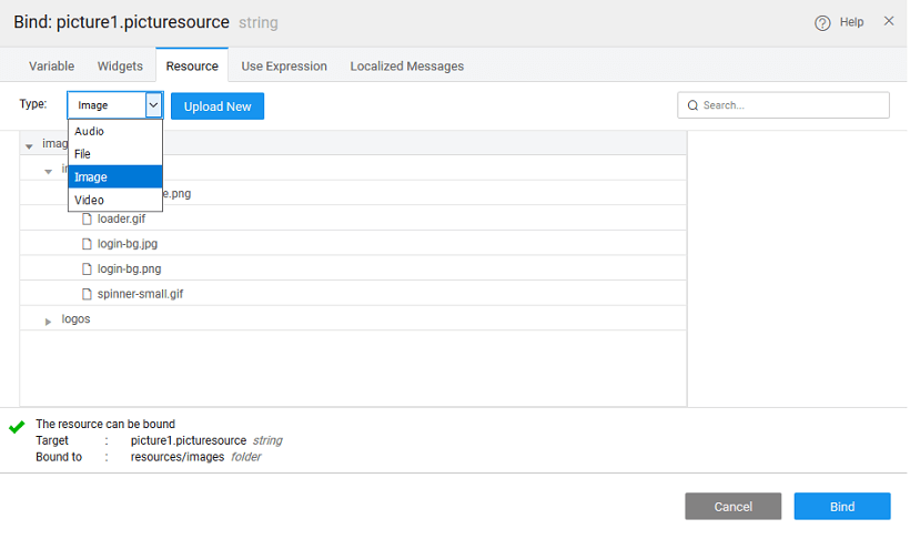 From the Property panel of the media widget, find the Video section. Locate the MP4 Source Path option and click the Bind icon represented by a chain-link as shown in the picture below; a Bind modal dialog pops-up.