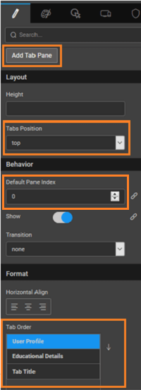 Default Pane Index | This property sets the default active pane on a load of the widget based on the provided index. The Tab Index is an integer starting from 0, 1, 2, and so on. That is, setting this property to 0 will display the first Tab pane; setting to 1 will display the second Tab pane. |