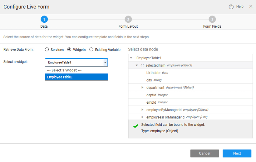 There can be different scenarios to deal with when configuring your Live Form Widget with a data source. The data source can be in the form of database CRUD variables or from an another widget, usually Data Table, on the page.