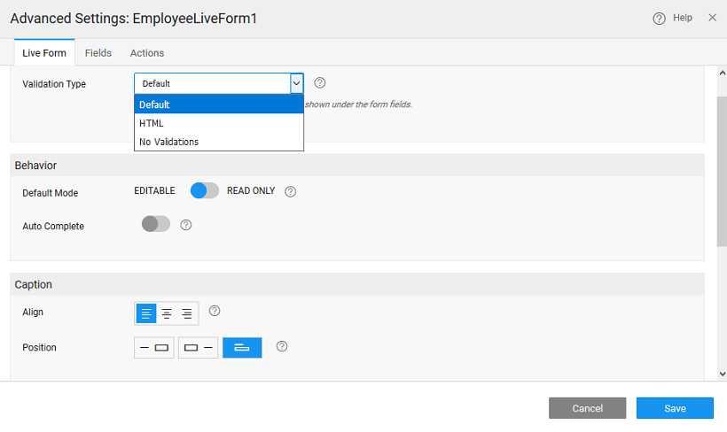 You can set the following properties of the Live Form.