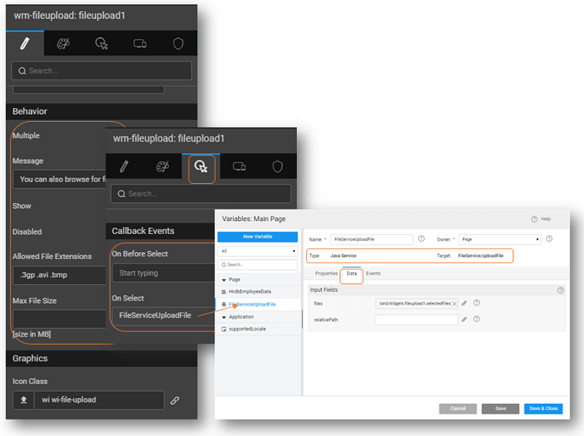 The FileUpload widget can be used to let users upload files to your apps. WaveMaker FileUpload widget generates a Java Service to enable additional file processing functionality.