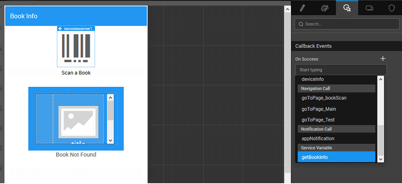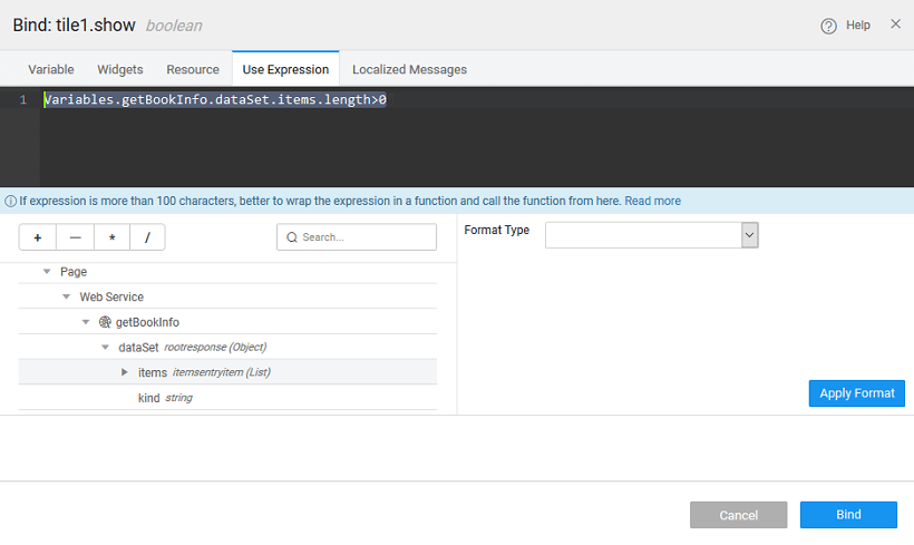 - Drag and Drop a Label to the page, set Caption property to ‘Book Not found’. Bind the Show property this label such that this label is shown when the Variable does not return any books.