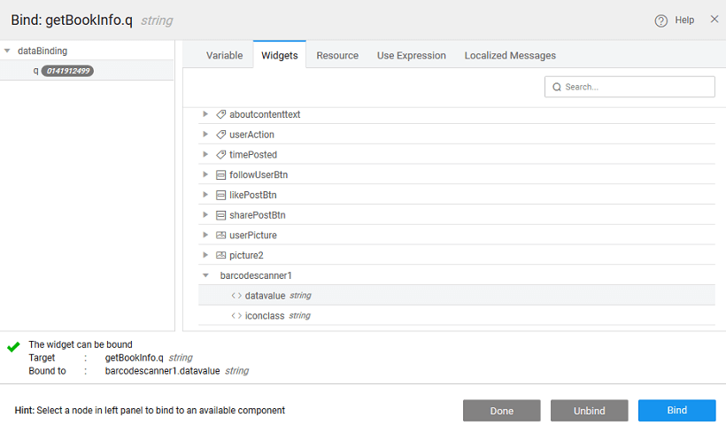 - Bind the value of q with barcode scanner ‘dataValue’ property and save the variable.