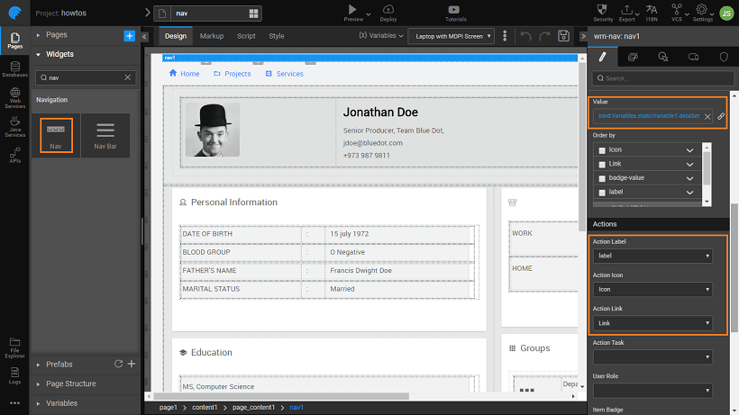 - Bind the Value property of the Menu widget to the variable created in the previous step.