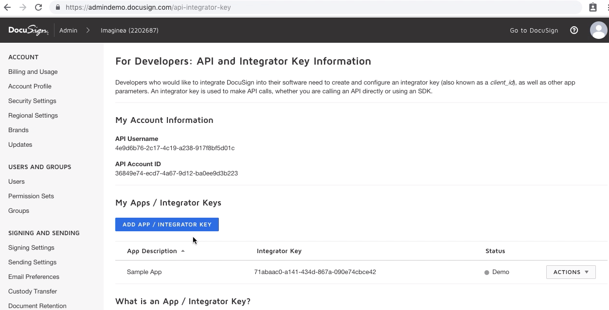 4. Integrator Key: Provide the Integrator Key derived for your Docusign App from the Docusign Admin console.