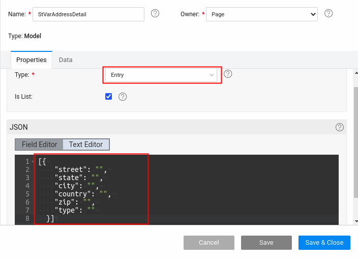 • Step-4: Create a model variable with Entry type and set the flag to the isList option and also the metadata same as the Child entity(Address Entity present in the database) as shown in the image below.