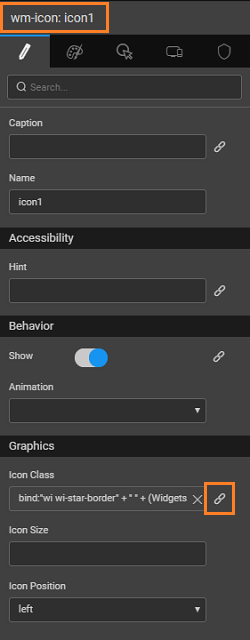 - Click on the Icon widget and for the "Icon Class" property click on the bind icon.