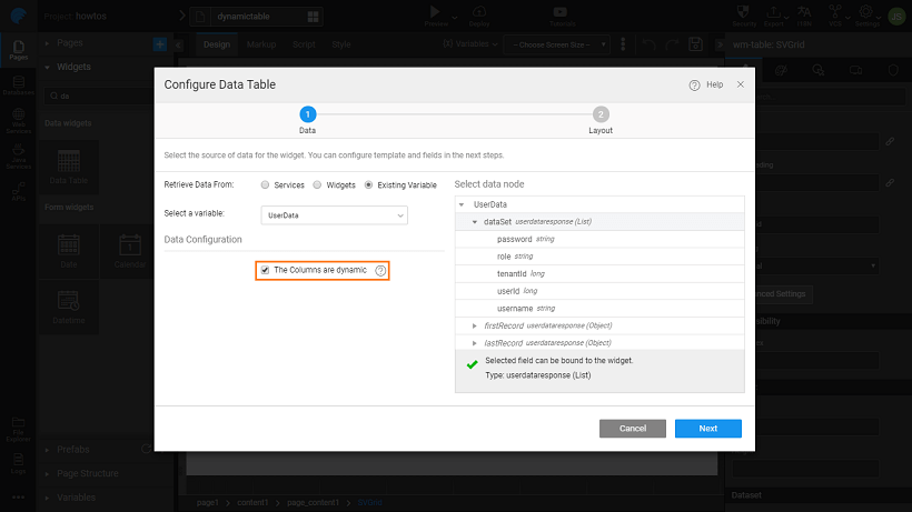 Drag and drop a Data Table widget on the canvas. While configuring the Data Table, select the option “The columns are dynamic”. Also, please note that we have chosen the UserData as the Source Variable. Thus User data will be displayed initially. You can configure it to any variable of your choice.