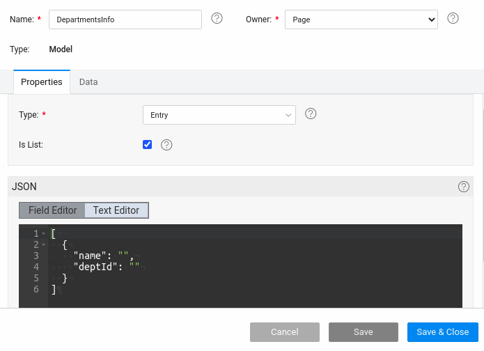 - Create a Page and create a Model Variable with an Entity type of the below specified dataset.