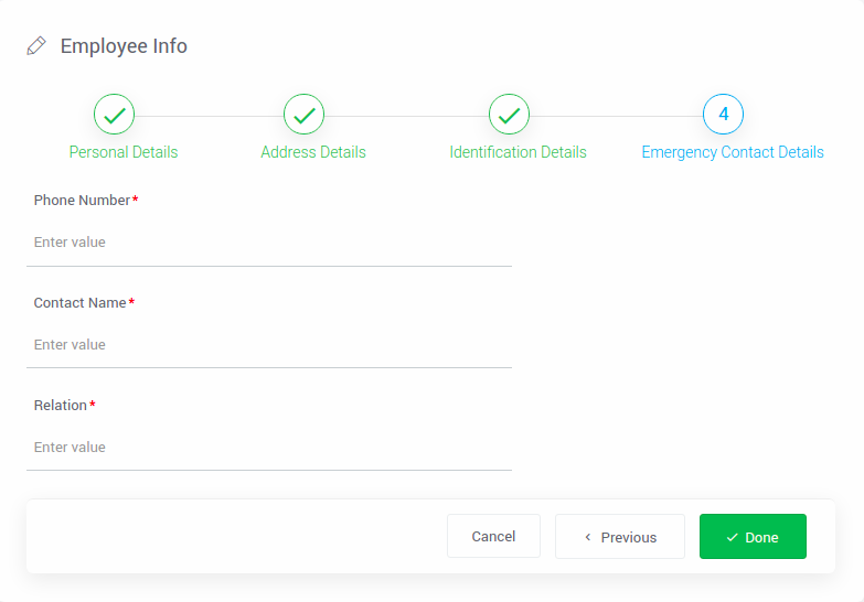 Consider a usecase where the Employee has to register this details(like personal details, Unique Identification details(like passport or PAN details etc), emergency contact details,address details etc.) after joining the organisation.
