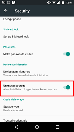 • On your android mobile, go to Settings > Security. Enable ‘Unknown sources: Allow installation of apps from unknown sources’