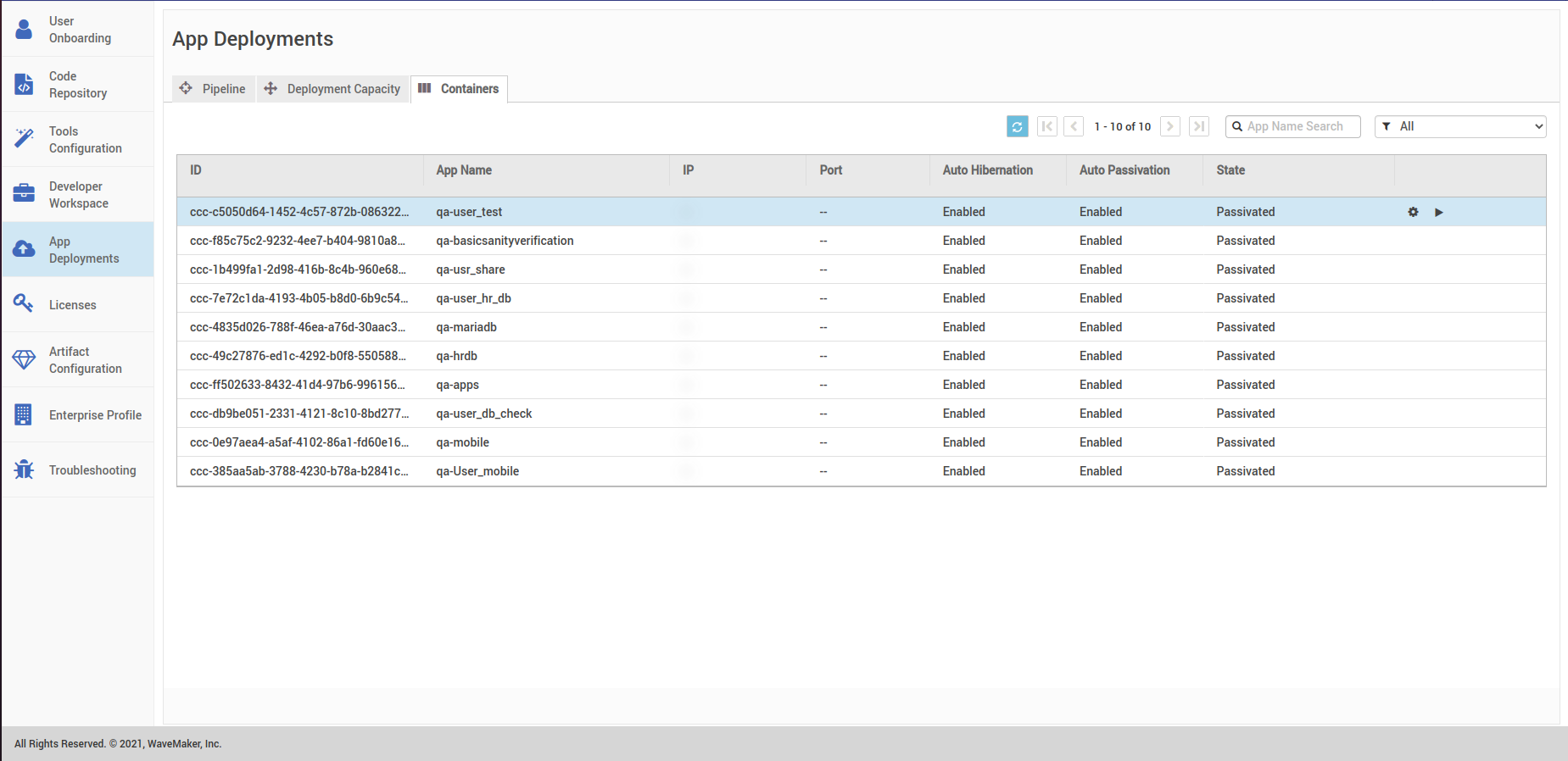 Passivate containers in StudioWorkspace/AppDeployment Instances from the launchpad