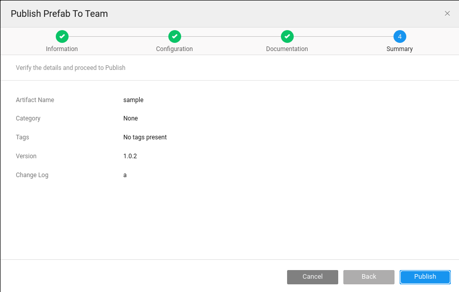 - Publish Info: This requires the Developer to enter the Category, Version, and Change Log. In case this Artifact uses or has a dependency on other Artifacts (for example, Project Shell using a Prefab), the dependencies are listed here.