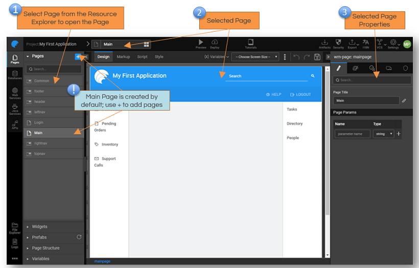 Once you create a project, the Main Page is created by default. You can add pages to the app, by using the + button next to the Page on Resource Explorer. On selection of a page, Canvas is provided: