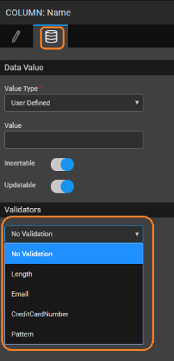 Validators have been introduced for database fields from the Database Designer. These can be used to enforce Server Side Validations for specific fields to be performed at the time of insert/update of data to the underlying database. These checks include length, a range of values, patterns like email, credit card numbers or any custom defined regular expression patterns. The type of validator depends upon the data type of the data column.